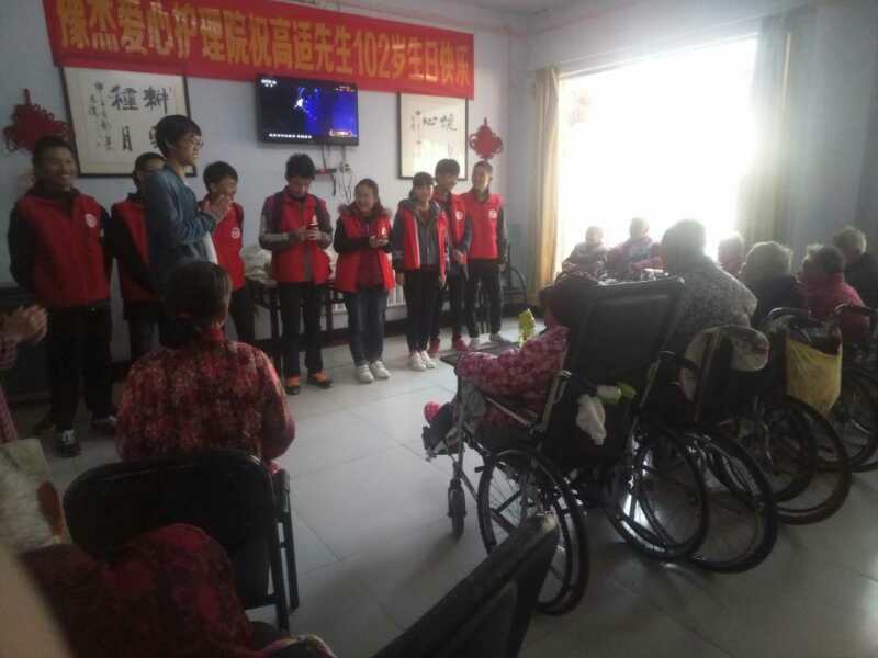 校歌》、《没有共产党就没有新中国》、《浏阳河》等经典歌曲。演唱过程中,有一位老人还热情的与同学们合唱,赢得了老人们和同学们的热情掌声。最后志愿者们帮老人们打扫卫生,收拾房间。活动结束后,豫杰爱心护理院的工作人员对同学们表示了感谢和赞许,希望同学们可以常来看望老人。