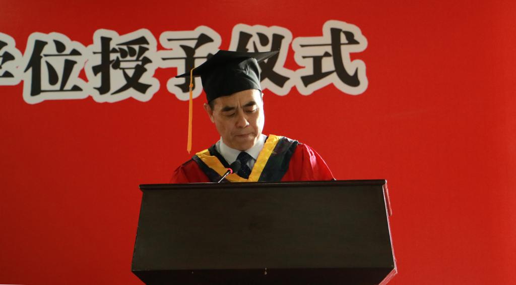 院长鲍鹏为省级优秀毕业生和校级优秀毕业生援正流苏,授予学士学位。许绍康、李社教、鲍鹏、党玉敬、柯杨、孔德志、岳建伟为毕业生援正流苏,颁发学士学位证书。