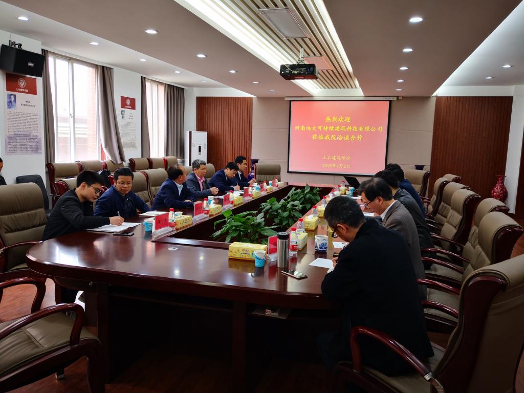 的发展概况、办学理念和科研情况等。河南远大可持续建筑科技有限公司总经理陆虎对其公司进行了介绍,并播放了企业部分成功案例,也提到目前装配式建筑存在的几个问题,诸如基础工程、屋顶等方面还未能实现装配式施工,装配式器械设备研发也滞后于施工。校企双方针对装配式建筑进行了深入的探讨,表达了校企合作的共同愿望。