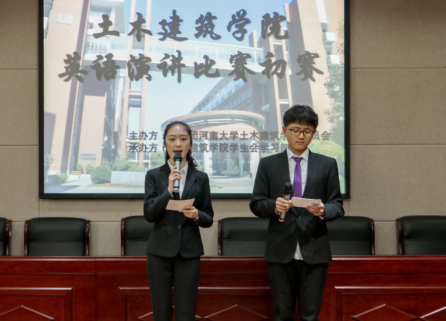 英语演讲比赛初赛在结构实验室二楼报告厅举行。出席本次比赛的有来自外语学院的三位评委孟苛、崔沐淼、朱豪杰,学生会主席团和17级、18级部分学生。