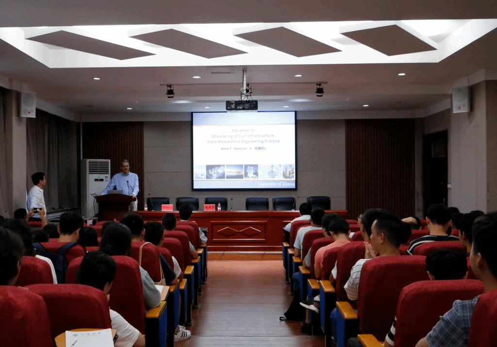 Spencer教授首先介绍了美国伊利诺伊州立大学的概况,及该校目前开展的“3+2”国际合作项目及国际暑期学校,提到伊利诺伊州立大学与我国有着优良的合作传统,并向同学们展示了伊利诺伊州立大学香槟分校土木工程学科在交通、结构、材料、水利等领域,尤其土木基础设施监测方面的最新进展。之后,Spencer教授跟大家分享了一种能有效解决同步监测的高精度无线智能传感器,并以韩国一个主跨344米的斜拉桥——金道大桥及迪拜一个直径250米的摩天轮为例,讲述了该传感器在实际工程中的应用。随后,Spencer教授介绍了计算机识别/视觉在混凝土结构裂缝检测、结构损伤自动分类、结构响应监测等方面的应用,并提出可以考虑用现有无人机在列车运行荷载下测量铁路桥梁位移。报告全程Spencer教授语言幽默风趣,赢得阵阵掌声。