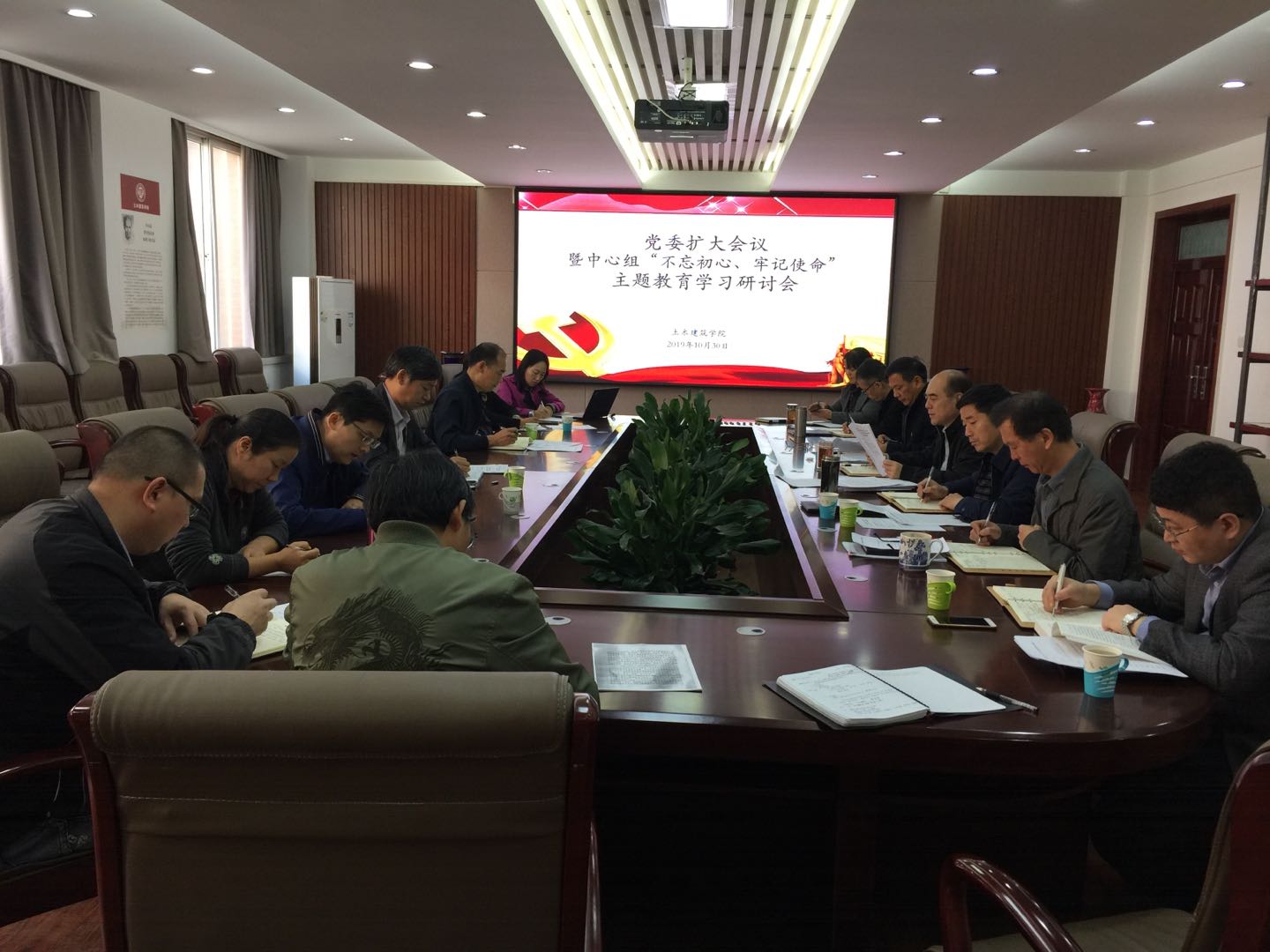 在院史馆204召开党委扩大会议暨中心组“不忘初心、牢记使命”主题教育学习研讨会,全体班子成员、教师和学生党支部书记参会,学校主题教育督导组成员郑铭勋、赵克强列席指导。学习研讨会由党委副书记党玉敬主持。
