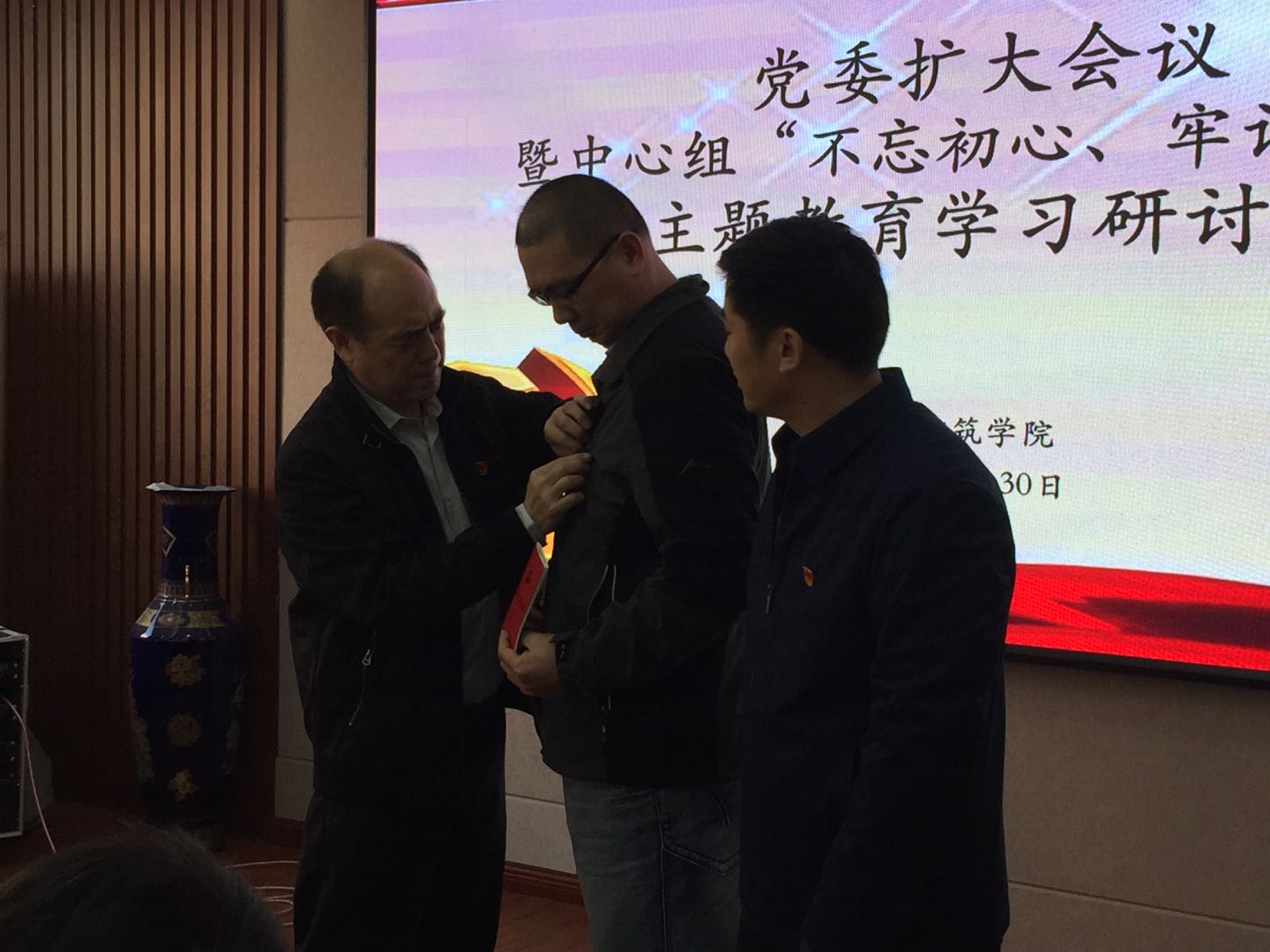 李书记和院长岳建伟一一为班子成员和支部书记配戴党徽和发放《中国共产党章程》读本。