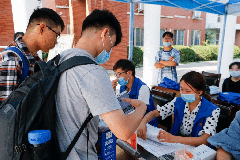 楼下迎新摊位的报到处,都有学生党员的身影,他们和迎新工作人员和志愿者一起,以饱满的热情迎接每一位同学的到来。他们主动为新生们讲解报道流程,引导新生办理入学手续,帮助新生提着沉重的行李箱,带领新生前往宿舍。每位学生党员都始终秉持着“明德新民,止于至善”的校训精神,耐心地为新生们答疑解惑,贴心周全地为他们服务,为新生入学开启了温暖的大门。