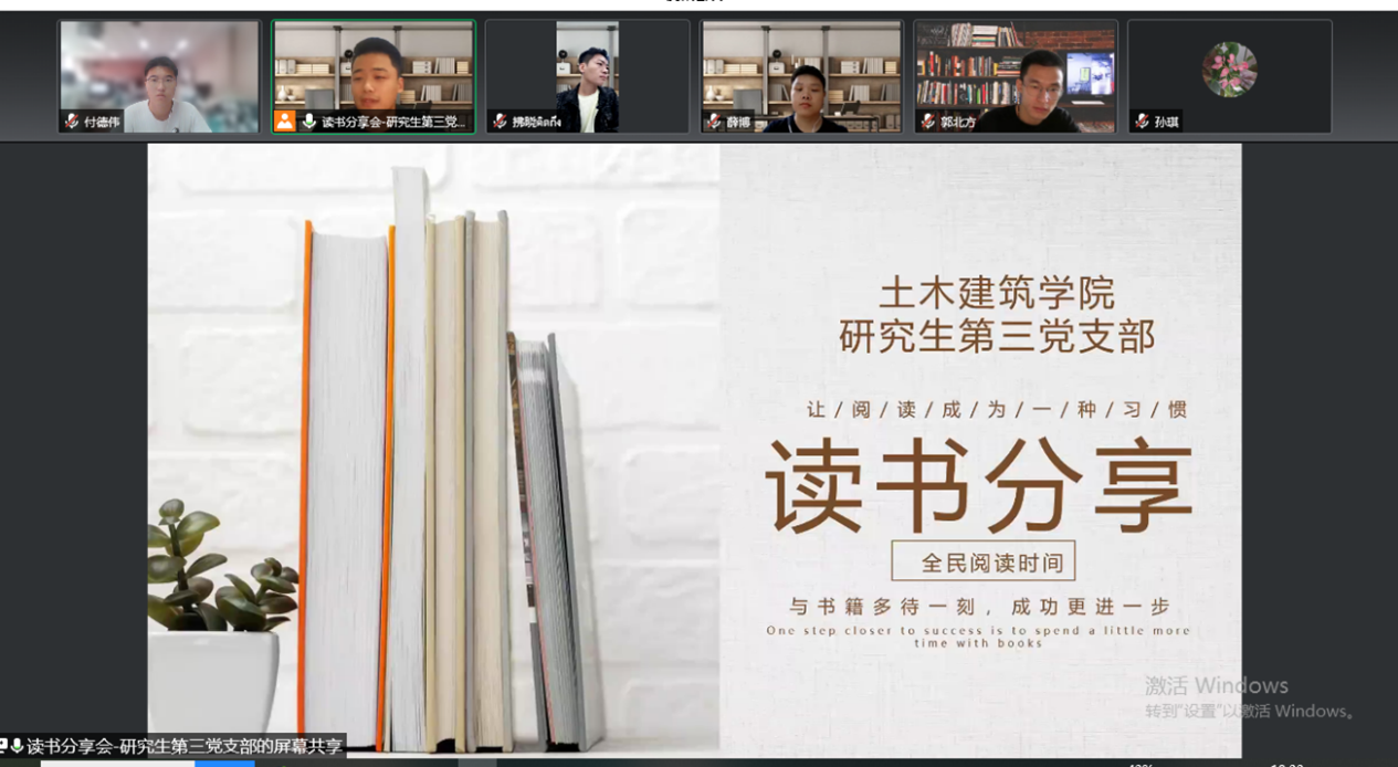 研究生第三党支部积极响应学院党委暑期“喜迎二十大悠悠书香情”读书活动,8月28日上午,通过线上会议方式,分享学习,总结经验,借此读书分享活动丰富支部同志们的精神内涵,增加前行的智慧和动力。