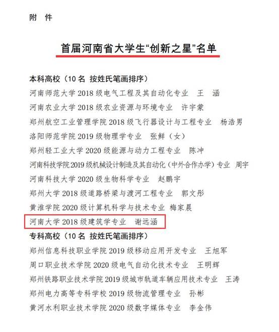 2018级建筑学专业本科生谢远涵荣获首届河南省大学生“创新之星”荣誉称号,并获专项经费支持。