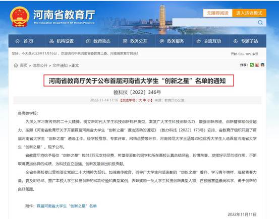 为贯彻落实省委省政府构建一流创新生态决策部署,激发大学生创新创业活力,增强大学生创新思维、创新精神和创业能力,选树新时代大学生创新创业标杆典型,河南省教育厅于2022年5月启动首届河南省大学生“创新之星”遴选活动。此次共评选出年度大学生“创新之星”20名,其中本科高校和专科高校各10名。经过学校推荐、专家评审、网络点赞等环节,麻豆传媒映画