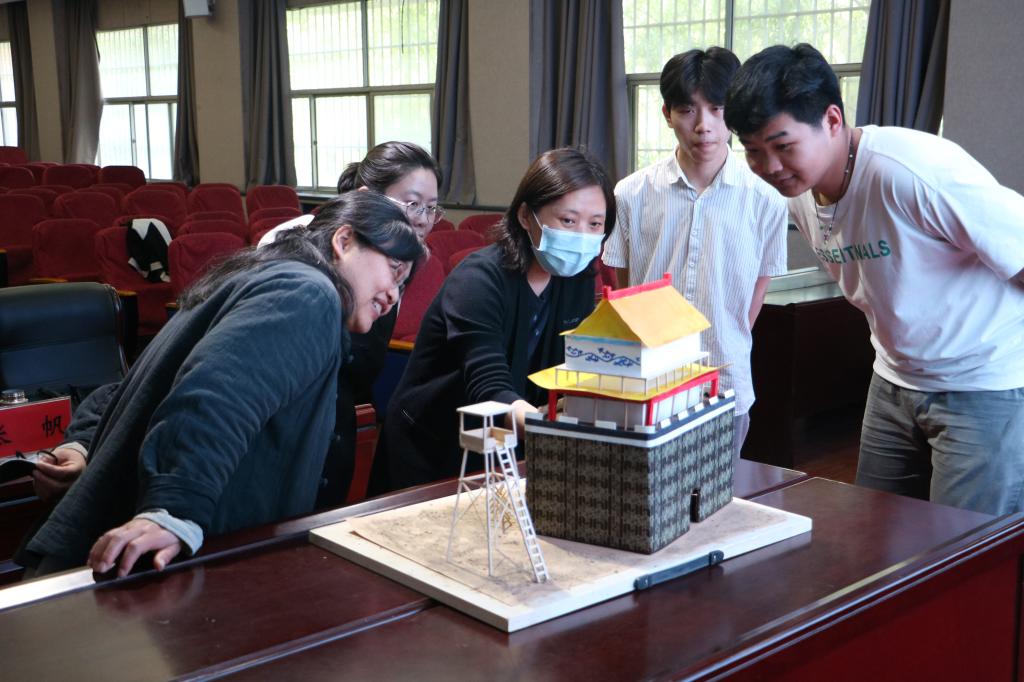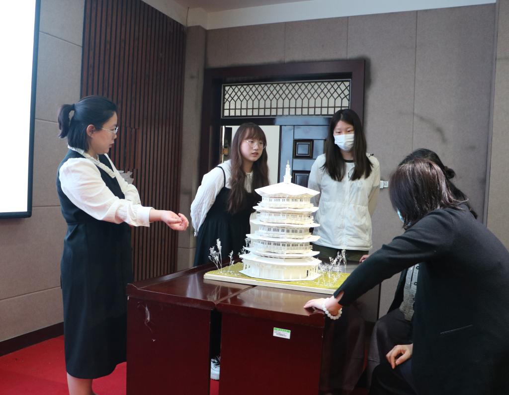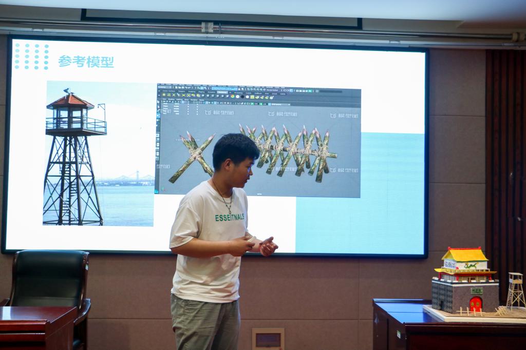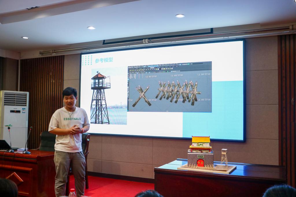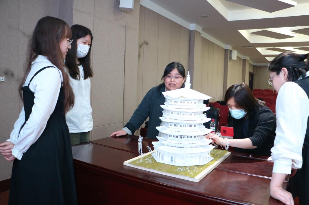 比赛分为两个环节,各组选手通过PPT从设计理念、作品细节、制作过程、结构特色、创意创新等方面进行展示,随后再由评委老师现场点评提问。现场不少作品让大家印象深刻。作品《永定楼》展现着该建筑设计秉持我国独特的古建筑风格,整体之雄浑而又不失精巧;作品《释迦塔》凸现该塔设计科学严密,构造完美、巧夺天工,是一座既有民族风格、民族特点,符合宗教要求的建筑,又是建筑结构与使用功能设计合理的典范;作品《伊斯兰艺术博物馆》重点介绍该建筑所运用的典型伊斯兰风格几何图案和阿拉伯传统拱形窗,为这座庞然大物增添几分柔和,中和了它的磅礴之气;作品《美国国家艺术馆》另具特色,注重对比和融合,该建筑外形采取古罗马式结构,分为东西两栋,一幢是充满现代风格的三角形建筑,一栋建筑为新古典式建筑,有着古希腊建筑风格。参赛同学展示的作品不仅体现了他们的专业素养,更展现了选手较强的动手实践能力以及创新精神、团队合作意识。