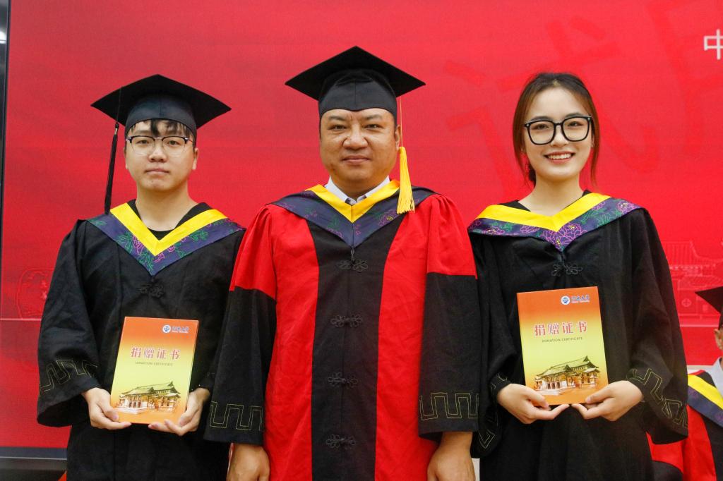 教育发展基金会的委托,李锋向积极参与“饮流怀源·微爱传递——毕业季一元捐”活动的2018级本科生代表张苏、2019级本科生代表罗雪龙颁发捐赠证书。