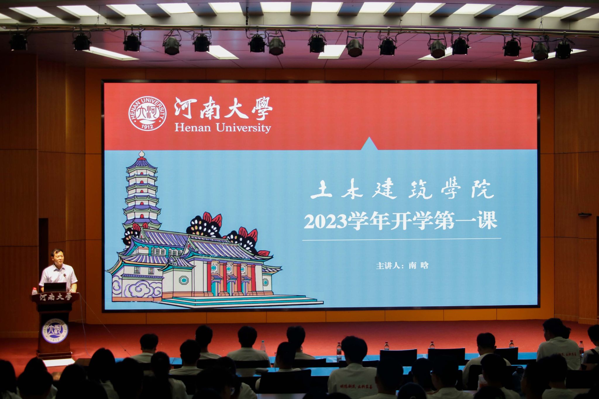 党委书记南晗于计算机大楼二楼报告厅为2023级全体本科新生开展入学教育。