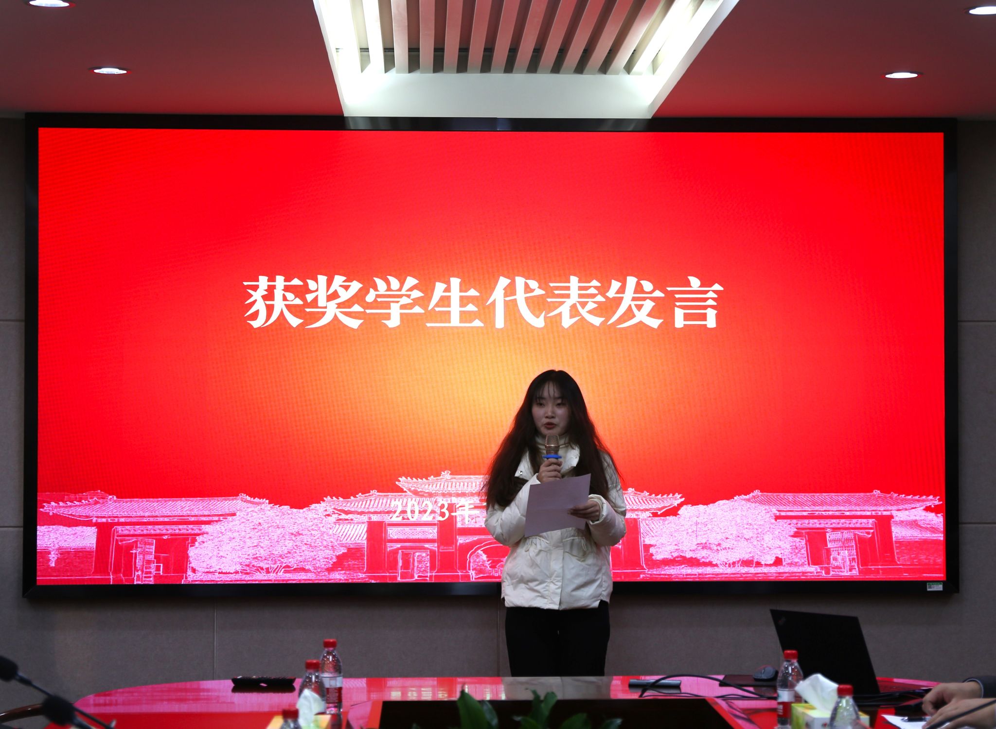 一等奖获得者李雅宁代表获奖学生发言,她首先对捐赠方的大爱和老师们的培养表达了感谢,并表示将会以此次获奖作为鞭策和动力,不断提高专业素养和个人能力,志存高远,努力成才,服务社会,回馈母校,为社会贡献自己的一份力量。