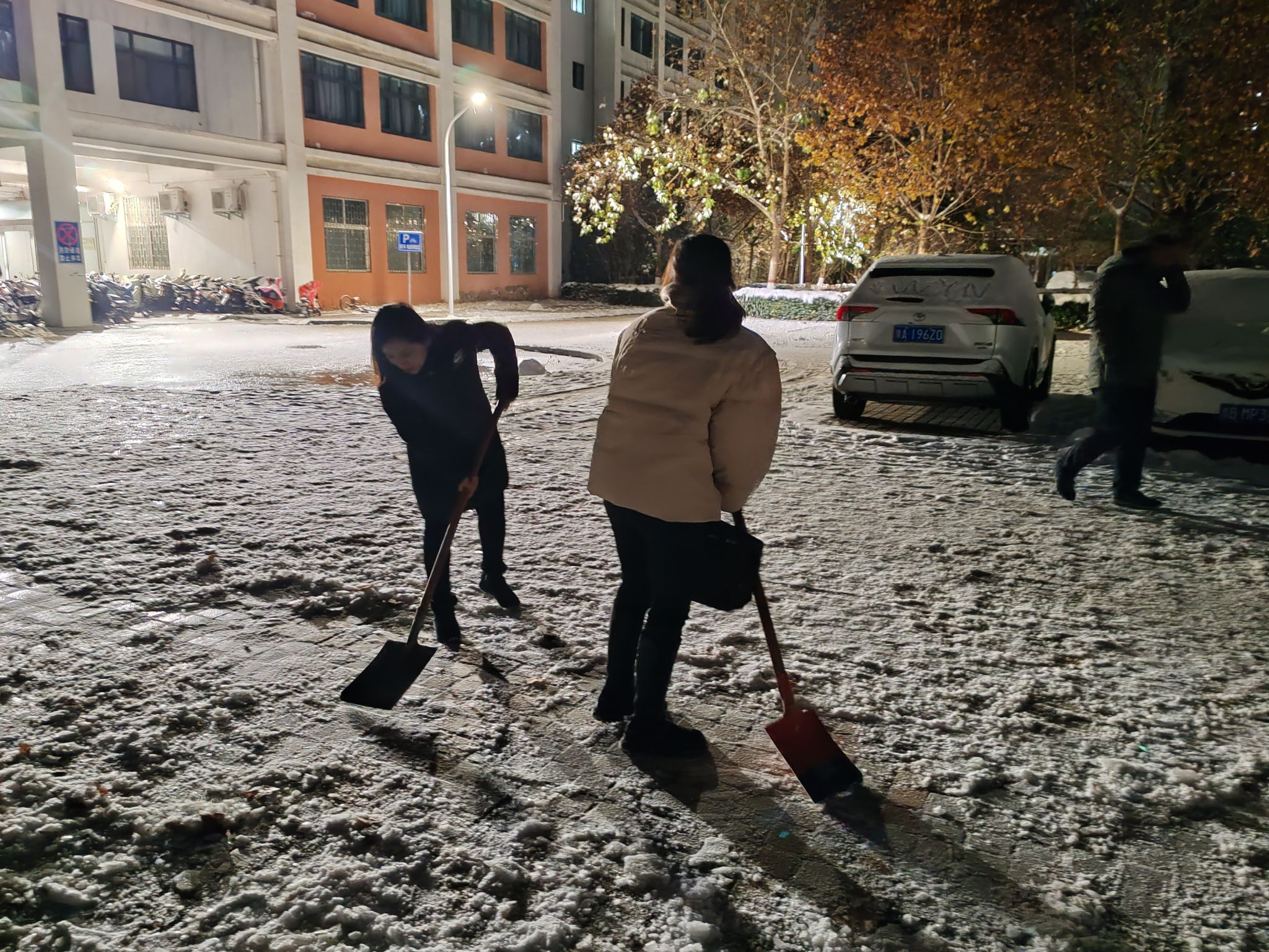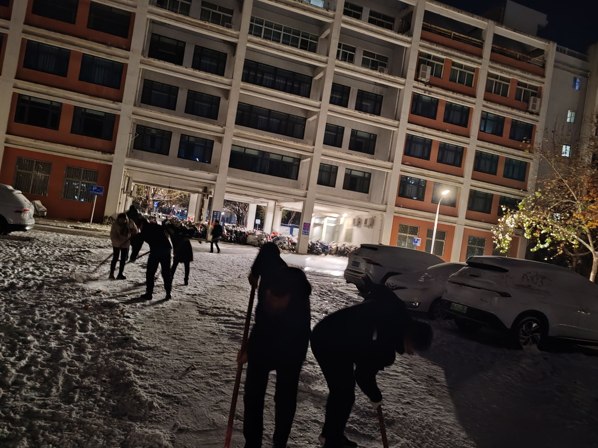 大家相互配合,干劲十足,铲的铲、推的推,虽然天气寒冷,但大家不畏严寒,手中的扫雪工具不停地挥舞着,有条不紊地将路面积雪逐一清理,他们忙碌的身影构成了一副温暖人心的画面。经过大家的共同努力,积雪覆盖的路面被打扫得干干净净,一条平安之路为师生们出行提供了便利条件。