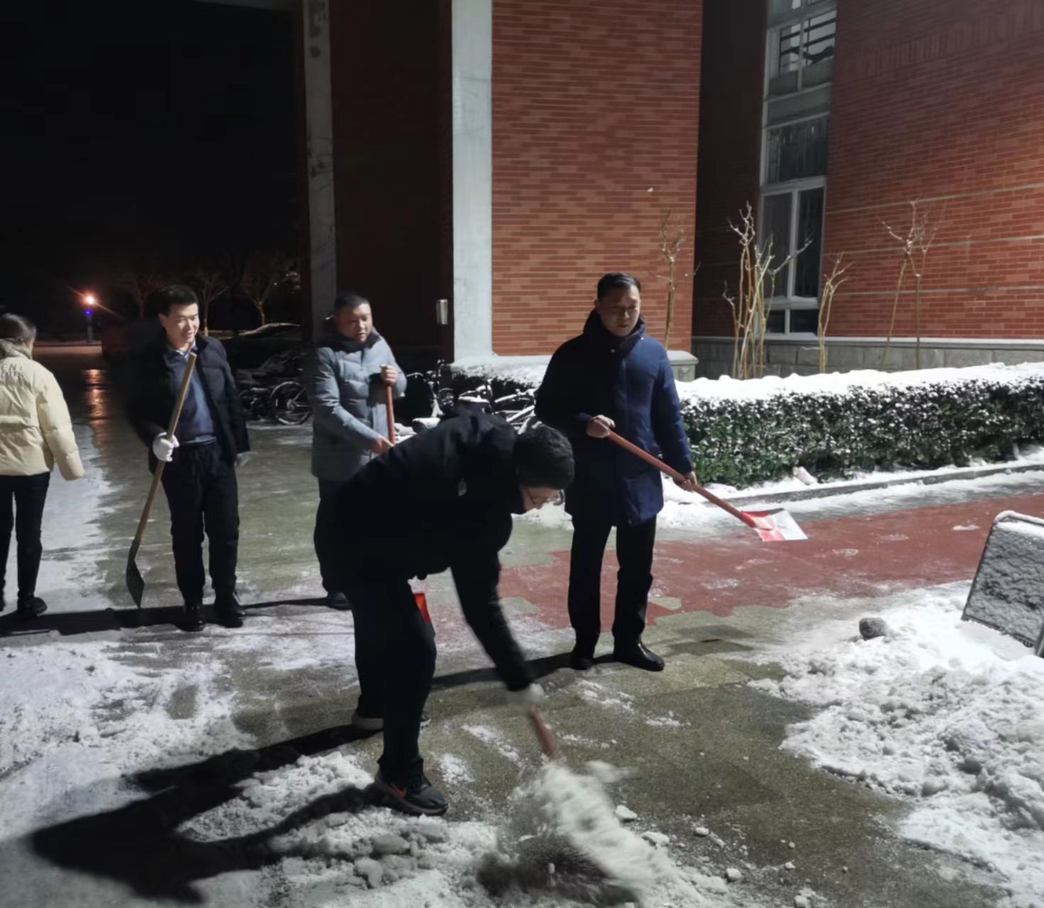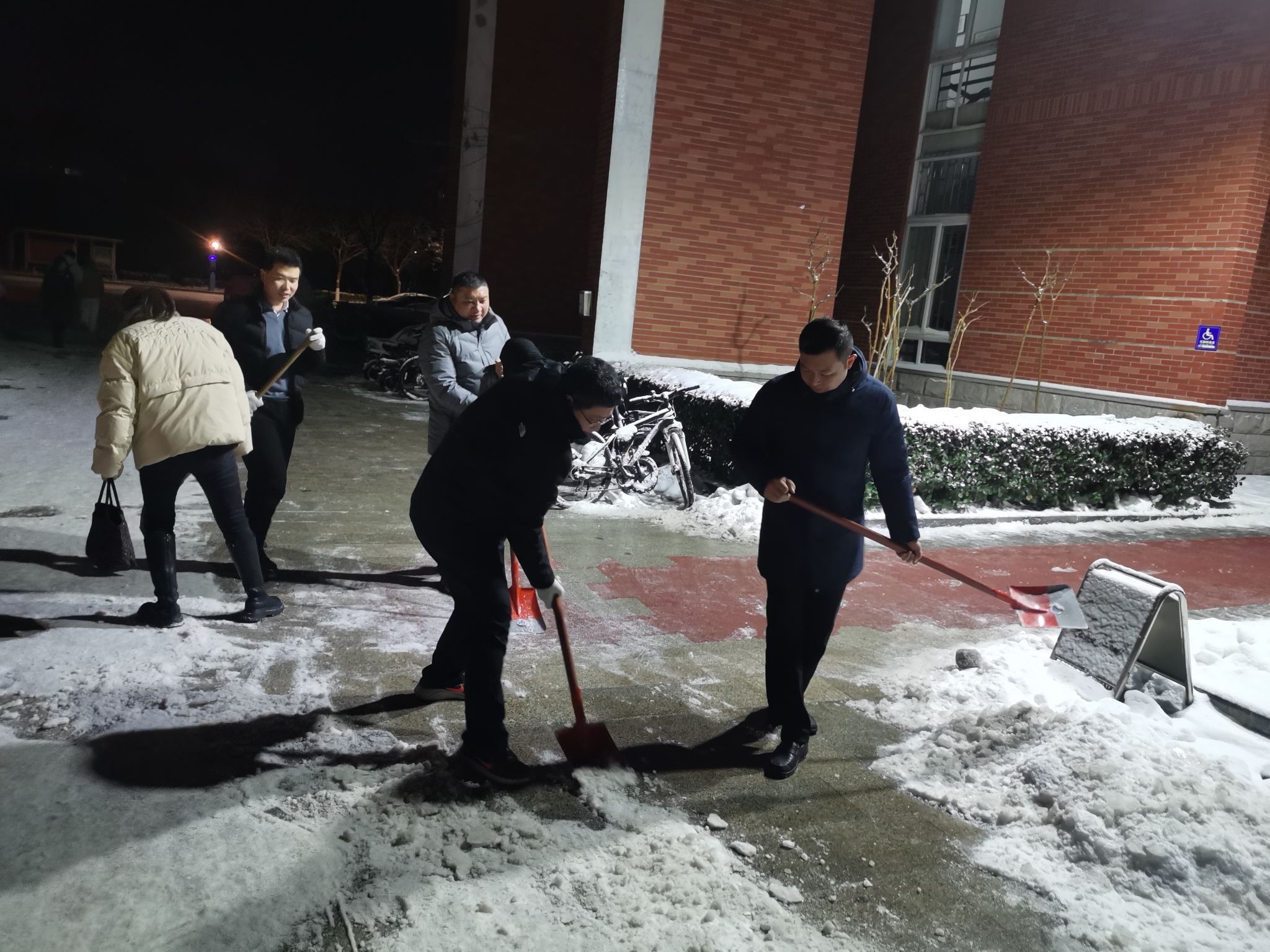 党委书记南晗、执行院长张建伟组织全体班子成员、教师来到学院出入口,责任主干道开展除冰铲雪活动。