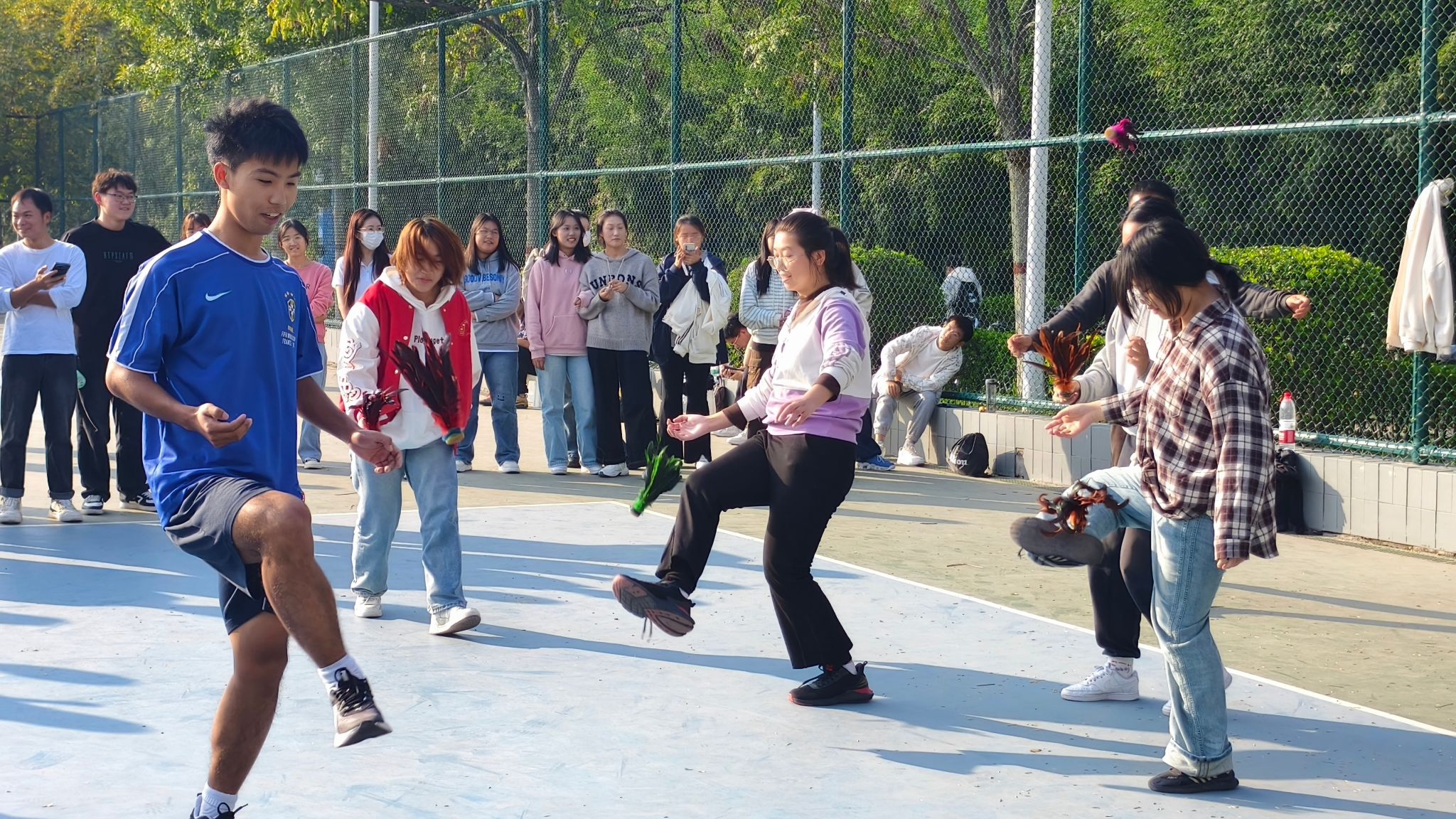 毽羽飞扬,青春热血,同学们个个神采奕奕、灵活敏捷,纷纷拿出看家本领,左一脚、右一脚,横着踢、倒着踢,反脚踢,各具特色,一时间五彩的鸡毛毽子在空中飞扬,上下翻滚,毽花翻飞,生动有趣。现场群众欢呼雀跃、呐喊加油。