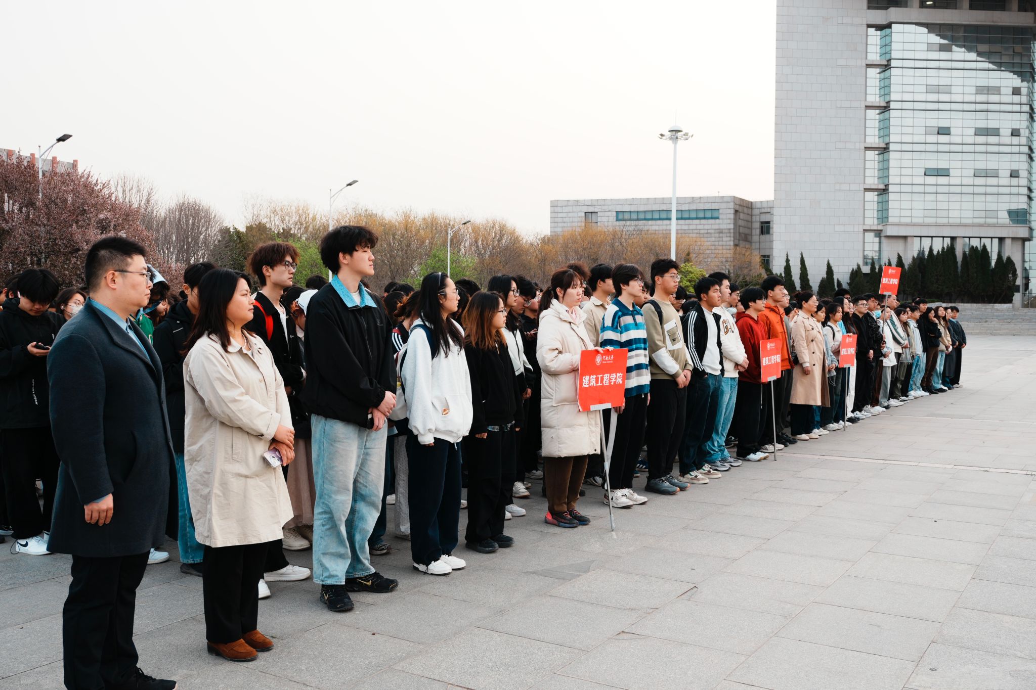 在金明校区图书馆前明德广场举行升国旗仪式。学院党委副书记宿云龙、各年级辅导员与全体本科生、研究生参加了仪式。