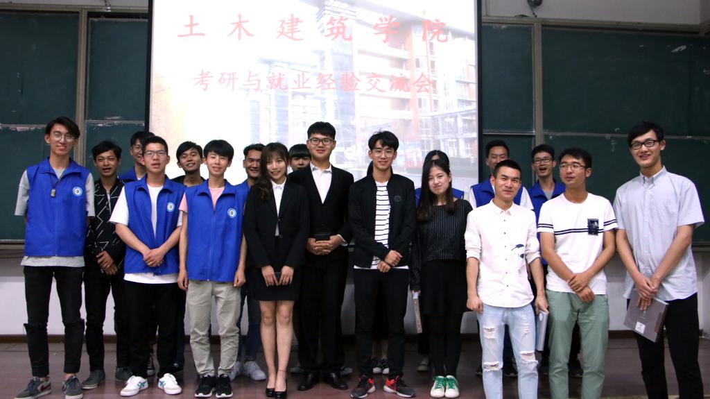 在主持人简单介绍之后,交流会正式开始。第一位分享的是道桥专业的曲凯,他就如何选取学校、如何复习专业课、考研初试以及复试这四个方面向同学们分享了他的经验。之后是建工班的曹长鑫,他根据自身经历,强调要做好专业课的复习工作,同时也要在学习的过程中保持良好的心态。紧接着,已考取西南交通大学的13级建筑学彭圣杰和同学们讨论了考研或参加工作的利弊,他还强调了明确方向的重要性,每个人要有自己的想法。而后,已被哈尔滨工业大学录取的崔玉开始了她的分享,她说,考研目标要明确,对于择校不能左右摇摆,崔玉学姐更强调严格的复习计划和笔记总结的重要性。最后,参加工作的梁永辉为同学们分享了他的就业经验,他从简历,面试,工作三个方面向我们讲述就业中可能遇到的各种问题,他的语言诙谐,现场同学反应良好。经验分享后同学们进行现场提问,五位嘉宾仔细阅读并认真回答了同学们的问题,现场互动效果良好。