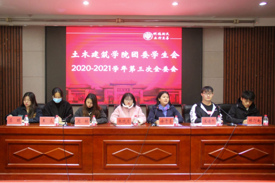团委学生会于3月18日下午13时在结构实验楼二楼报告厅举行2020-2021学年第三次全委会。出席会议的有学院团委书记徐贵香老师、学生会主席团成员、学生会各部门部长及委员,本次会议由学生会主席温皓然主持。
