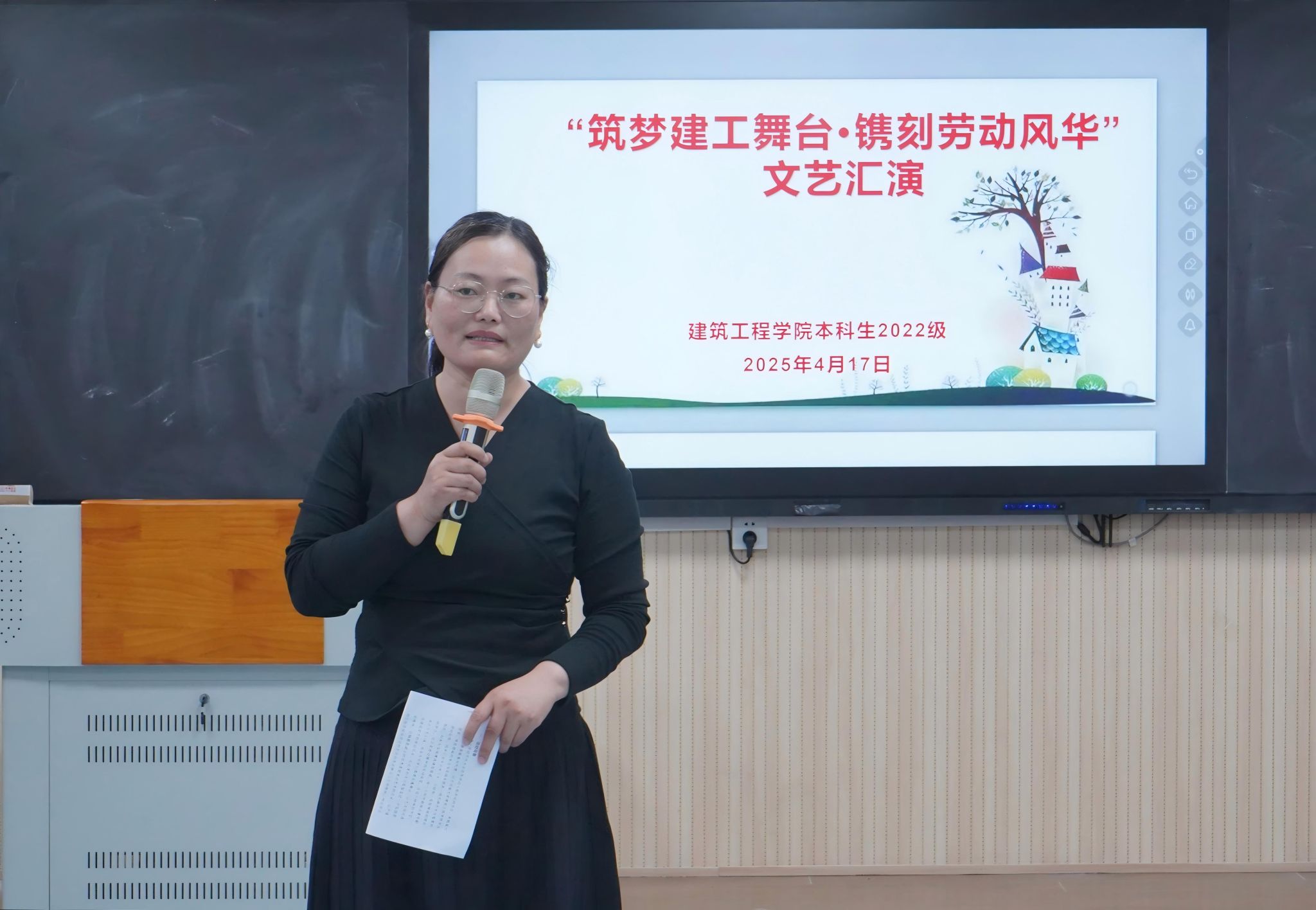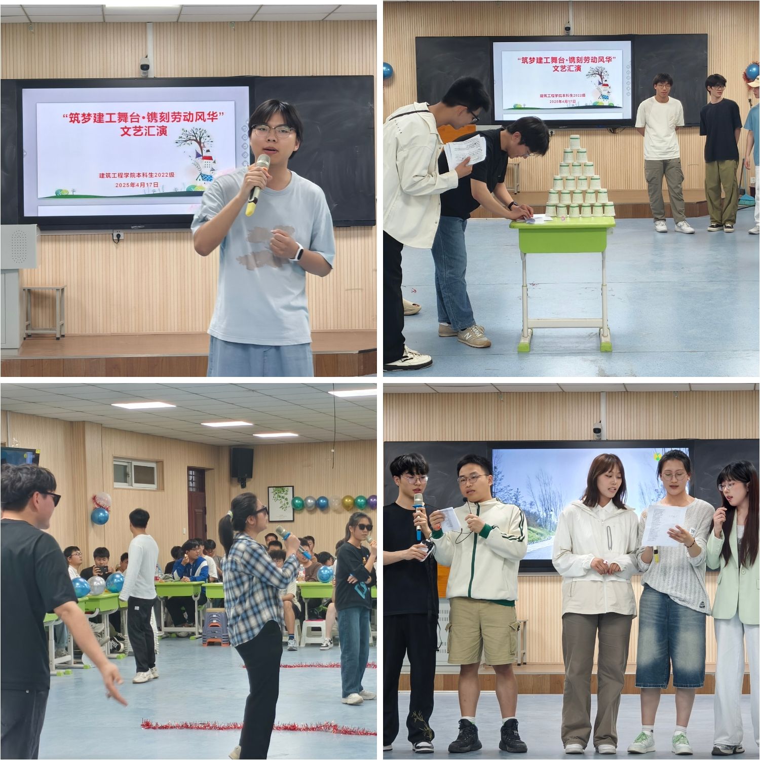 2022级本科生在学院606智慧教室举办了一场别开生面的文艺晚会。晚会以“筑梦建工舞台·镌刻劳动风采”为主题,通过朗诵、歌舞、魔术等多样化的节目形式,展现了建工学子的多才多艺与青春活力。