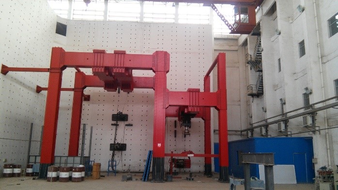 (1)L形反力墙高16.5米、实验台座区面积1200m2,拥有6通道电液伺服协调加载系统和六柱大空间加载架。该系统是结构实验的基本平台,该系统能够进行静力试验、拟静力试验的加载试验。