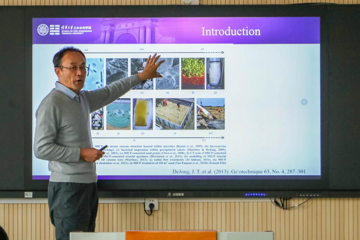 From 3 to 5 p.m. on November 26, Professor Wei Yingqi, Associate Professor Cheng Xiaohui of Civil Engineering Department of Tsinghua University and deputy director of Geotechnical Engineering Research Institute of China Academy of water resources and hydropower Sciences, was invited to give a speech entitled "a feasibility study of high strength micp based soil" in 606 of 16b smart classroom of our institute "Improvement" and "special test technology and experiment of large geotechnical centrifuge". Professor Yue Jianwei, President of the Institute, presided over the symposium, which was attended by some teachers and students of civil engineering.