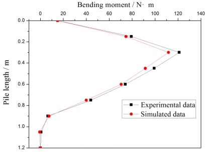 Figure 2. Comparison of test results and our finite element calculated values of the pile under various load: (a) load-displacement; (b) bending moment.