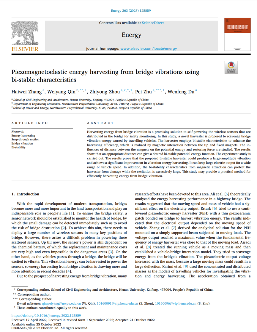 钢与空间结构研究所周志勇课题组在国际能源类知名期刊《Energy》(中科院JCR一区期刊,影响因子9)期刊上发表题为“Piezomagnetoelastic energy harvesting from bridge vibrations using bi-stable characteristics”的研究论文。该研究成果是麻豆传媒映画