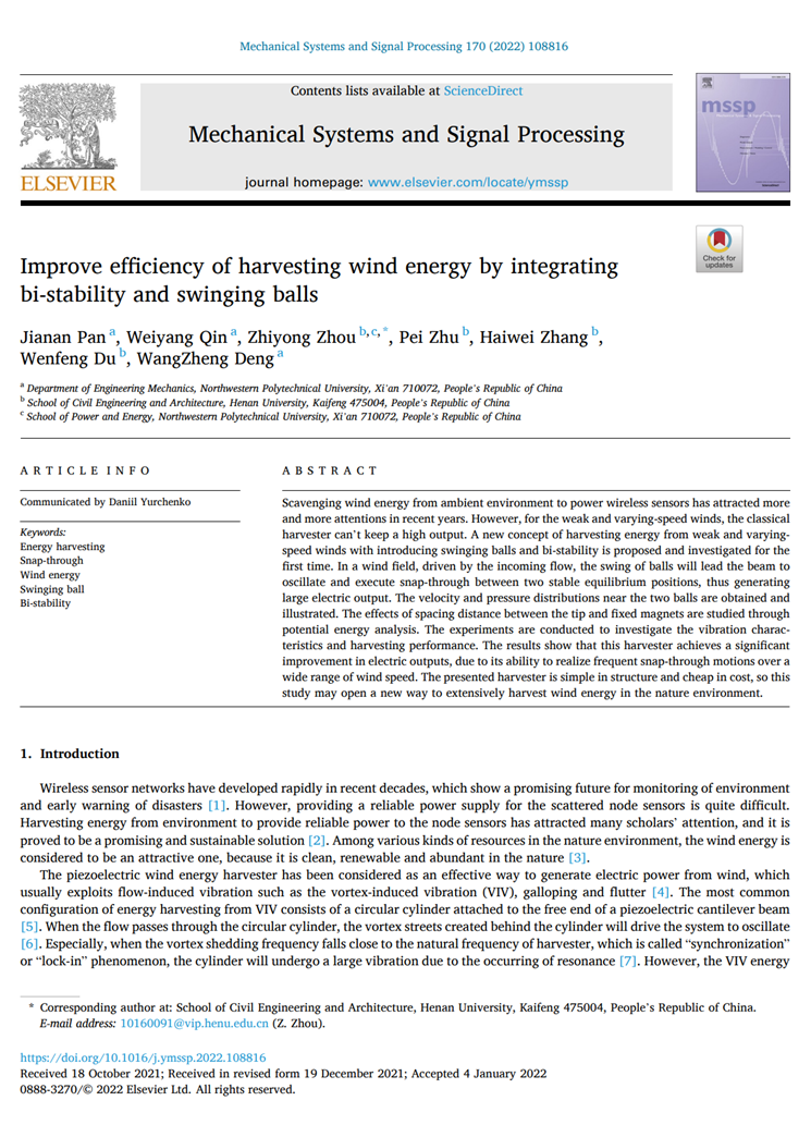 钢与空间结构研究所周志勇课题组在国际能源类知名期刊《Mechanical Systems and Signal Processing》(中科院JCR一区期刊,影响因子8.4)期刊上发表题为“Improve efficiency of harvesting wind energy by integrating bi-stability and swinging balls”的研究论文。该研究成果是西北工业大学工程力学系与麻豆传媒映画