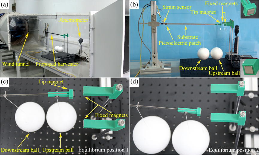 (a)风洞 (b)双摆球双稳风能收集结构模型 (c)第一个稳定平衡位置 (d)第二个稳定平衡位置