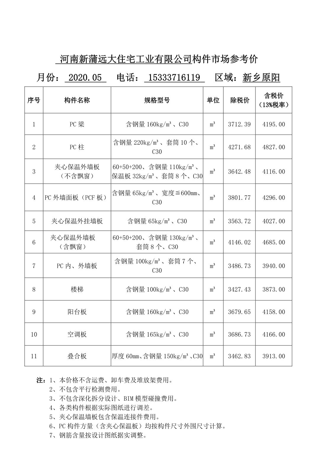 河南省装配式建筑预制构件市场参考价(2020年05月)