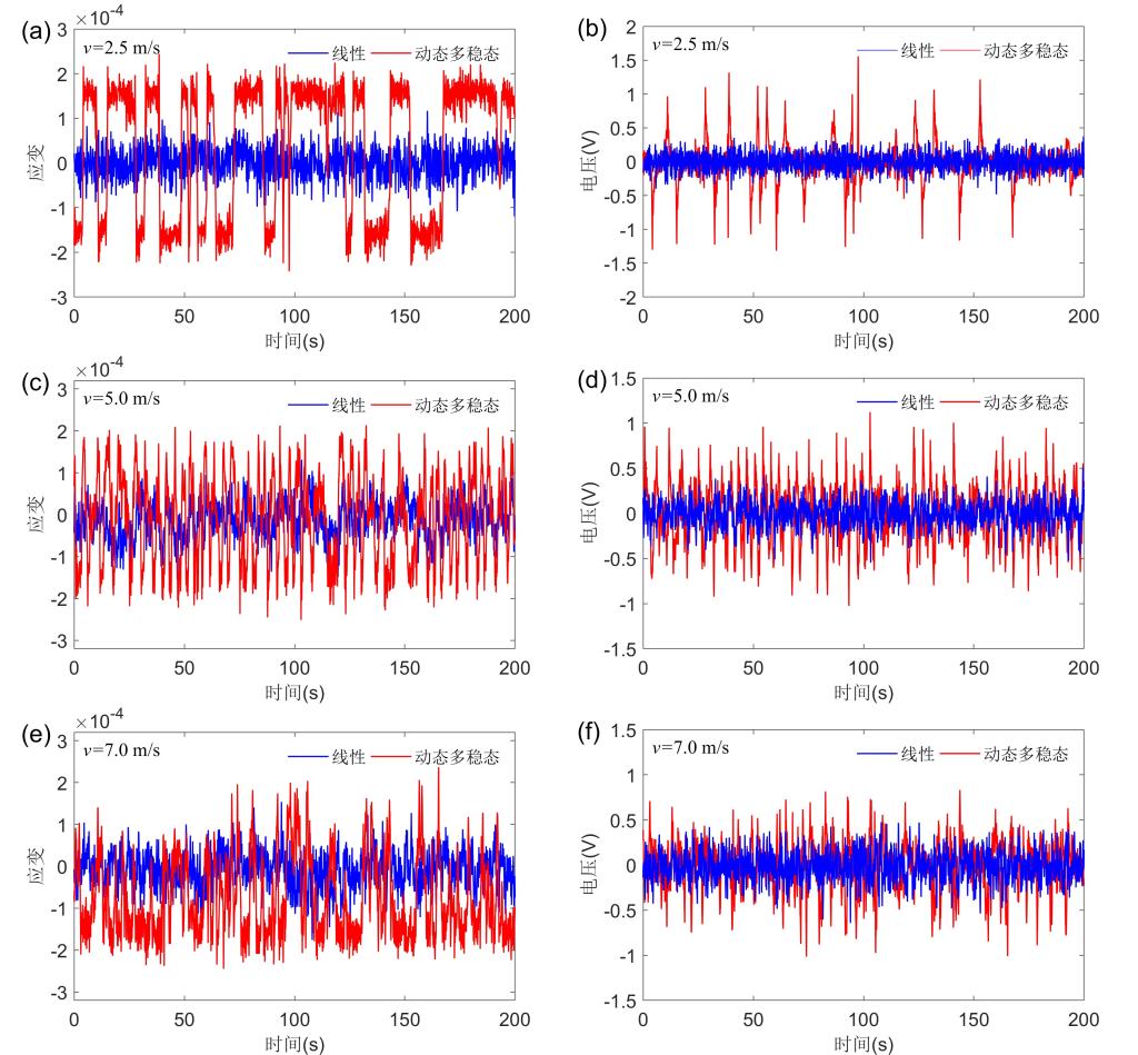 本研究将多稳态特性应用于传统的颤振式结构,提出了一种动态多稳态风能量收集结构,这种结构在不同风速下具有动态的稳定特性。具体而言,在较低的风速下,系统呈现双稳态特性,在两个稳定的平衡状态发生阱间跳跃现象,跳跃时电压会出现脉冲幅值,从而增加风能收集效率;在较高的风速下,系统在中间位置出现了一个新的稳定平衡位置,系统由双稳态系统变为三稳态系统,通过在三个稳定平衡位置的阱间跳跃可实现密集的高电压输出,而且最大能量输出发生在三稳态状态下。