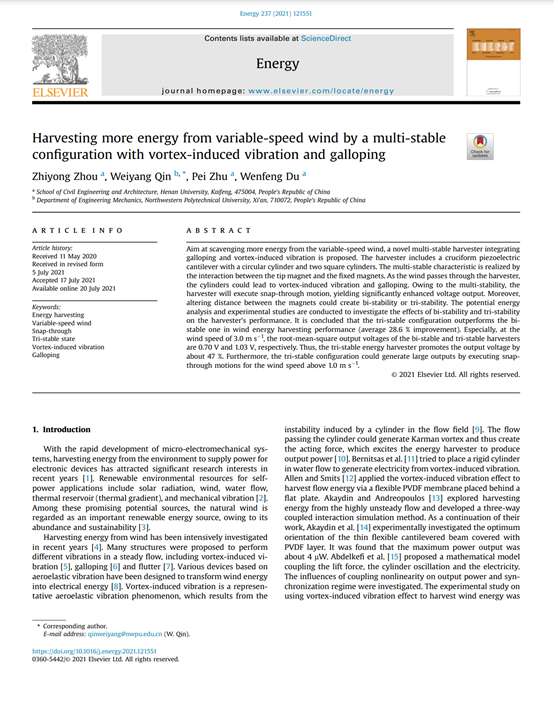 周志勇副教授课题组在国际能源类知名期刊《Energy》(中科院JCR Top期刊,影响因子7.147)上发表题为“Harvesting more energy from variable-speed wind by a multi-stable configuration with vortex-induced vibration and galloping”的研究论文。该研究成果是麻豆传媒映画