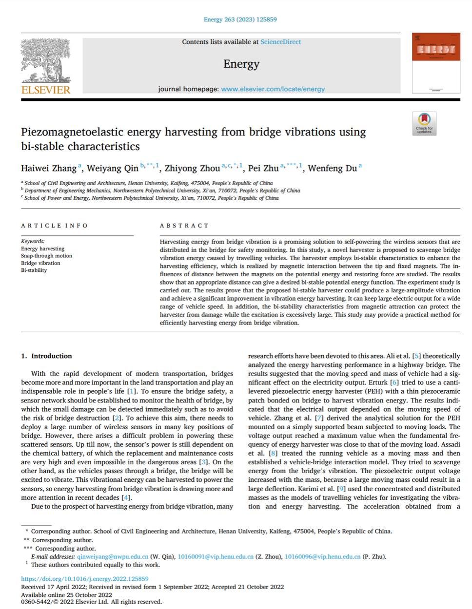 钢与空间结构研究所周志勇课题组在国际能源类知名期刊《Energy》(中科院JCR一区期刊,影响因子9)期刊上发表题为“Piezomagnetoelastic energy harvesting from bridge vibrations using bi-stable characteristics”的研究论文。该研究成果是麻豆传媒映画