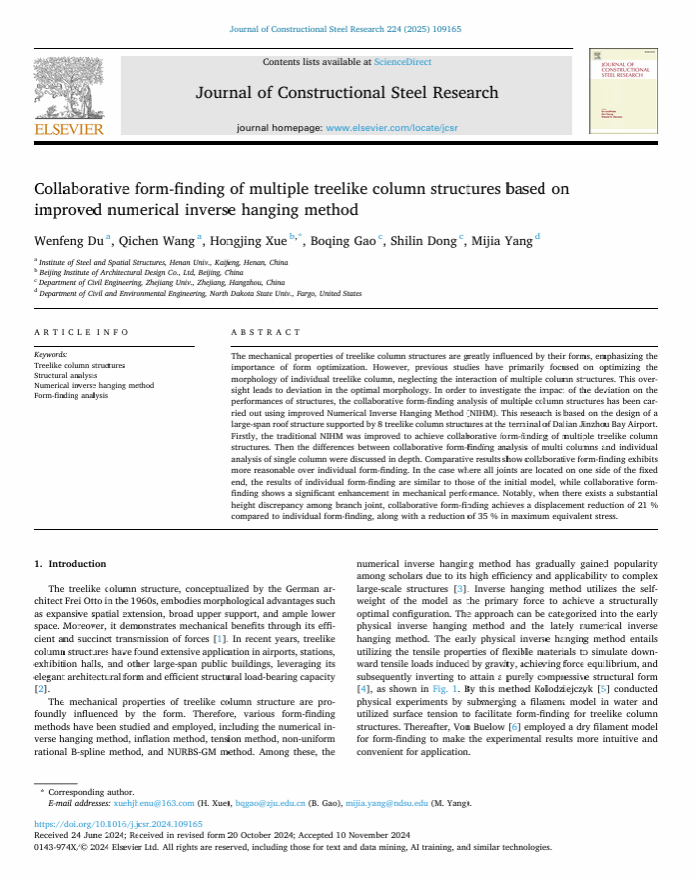 钢与空间结构研究所杜文风课题组在国际土木工程领域知名期刊《Journal of Constructional Steel Research》(中科院二区期刊,影响因子4.2)上发表题为“Collaborative form-finding of multiple treelike column structures based on improved numerical inverse hanging method”的研究论文。该研究成果是麻豆传媒映画
