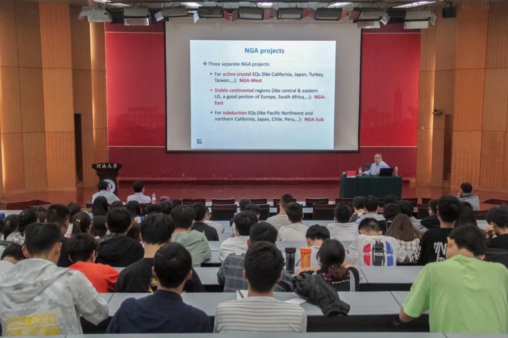 然后,Yousef Bozorgnia教授从地震时地面运动的危害引出“NGA”项目,之后向同学们详细讲述了“NGA”项目的研究过程,包括各项目基础数据的采集、数据库的构建及数据统计分析,最后指出地震动预测方面研究的不足及未来的研究前景。