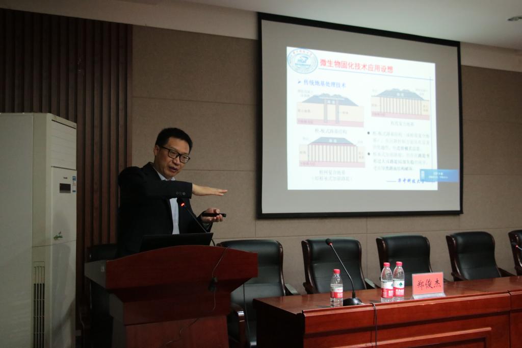 副院长张建伟首先介绍了郑俊杰教授的学术经历、研究方向及学术成果,之后报告在大家热烈的掌声中拉开帷幕。郑俊杰教授从微生物加固的研究背景及意义为切入点,回顾了这项研究在国内外的开展情况、主要的研究团队及其研究成果,着重讲述了微生物固化的注菌方法、微生物固化砂土的强度增长机理及微生物固化技术的应用前景。郑教授提到,尽管微生物岩土加固技术具有清洁干净、能耗少、设备简单等优势,但该项技术距离实际工程中应用还有很长的路要走,仍有一系列关键问题需要解决。张建伟副院长对报告进行了总结。