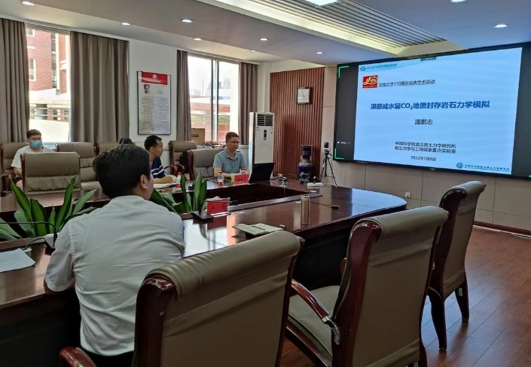 潘鹏志研究员报告的题目为《深部咸水层二氧化碳地质封存岩石力学模拟》。报告主要介绍了运用数值模拟的方法分析在多场耦合作用下的利用深部咸水层进行二氧化碳封存后的岩石力学响应状况,同时介绍了其团队自主研发的一款工程岩体破裂过程分析软件CASRock,详细介绍了如何利用该软件分析深部咸水层封存二氧化碳后的岩石力学多场响应机理。在报告会后,潘鹏志研究员对老师及同学提出的问题进行了解答,同时对关于岩石力学多场耦合数值分析,以及未来在深地空间等方面如何开展研究进行了深入的探讨和交流。