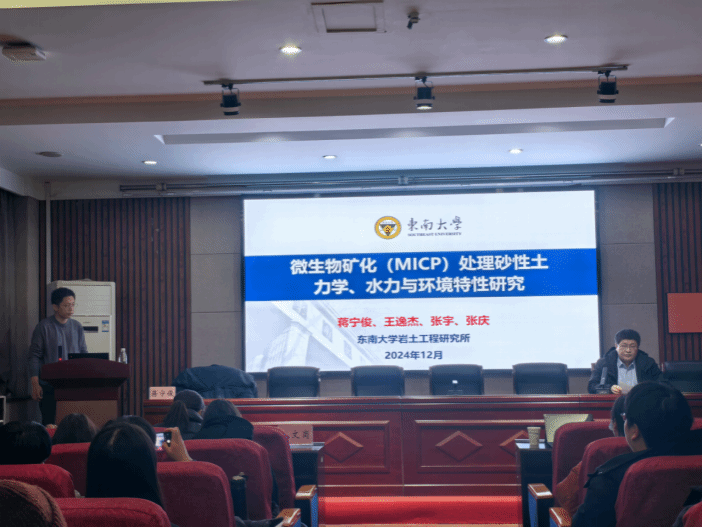 2024年12月15日,东南大学研究生院副处长蒋宁俊应邀来到学院,做题为“微生物矿化(MICP)处理砂性土力学、水力与环境特性研究”的学术报告。学院土木工程专业师生参加了报告会,报告会由执行院长张建伟主持。